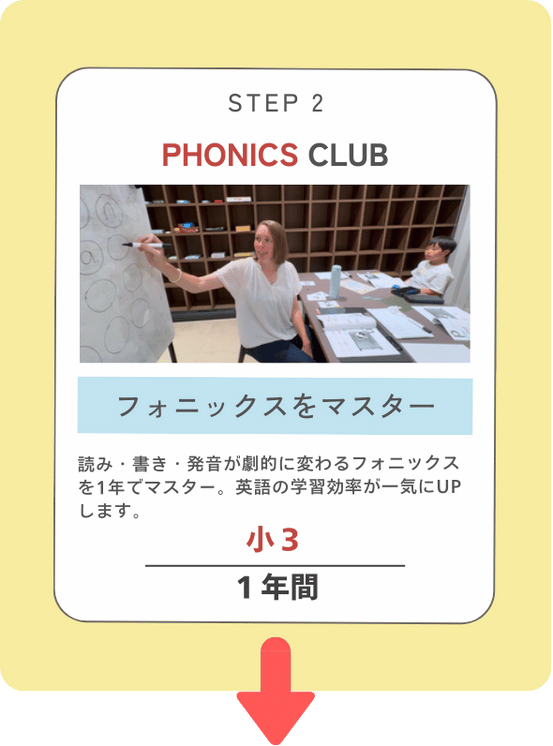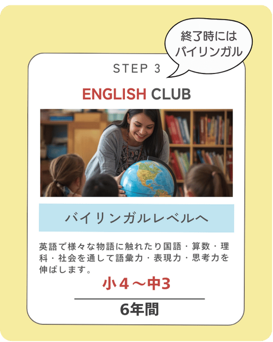 最大11年間(TEAMO ENGLISH PLAY CLUB 4年、TEAMO PHONICS CLUB 1年、TEAMO ENGLISH CLUB 6年)