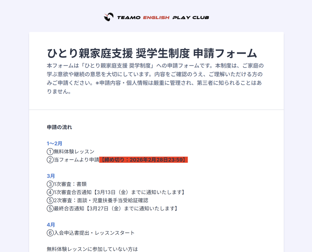 経済的な事情で教育をあきらめざるを得ないご家庭のお子様に「社会で役に立つレベルの英語力を身に付ける」まで長期的にサポートする当スクール独自の奨学制度です。教育格差を減らすことを目的としています。